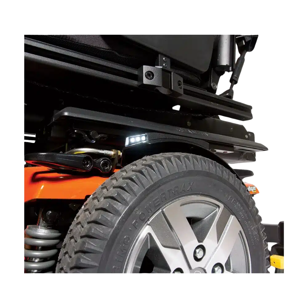Las luces LED en los guardabarros vienen de serie en los modelos Edge 3 Stretto, Edge 3, iLevel, 4Front 2, 4Front 2 HD, Q6 Edge HD y Q6 Edge 2.0. Estas luces LED para sillas de ruedas ofrecen grandes beneficios y características para aumentar la visibilidad. Con la iluminación montada en el guardabarros, sobre la rueda motriz a cada lado de la silla eléctrica, las luces del guardabarros ayudan a garantizar que puedas ver y ser visto.