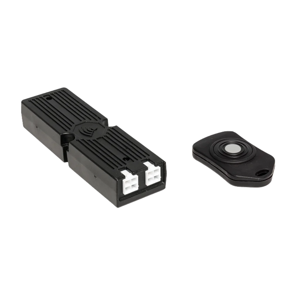 El dispositivo Quantum Remote Stop Switch consta de un receptor que se monta en la base eléctrica y un control remoto.